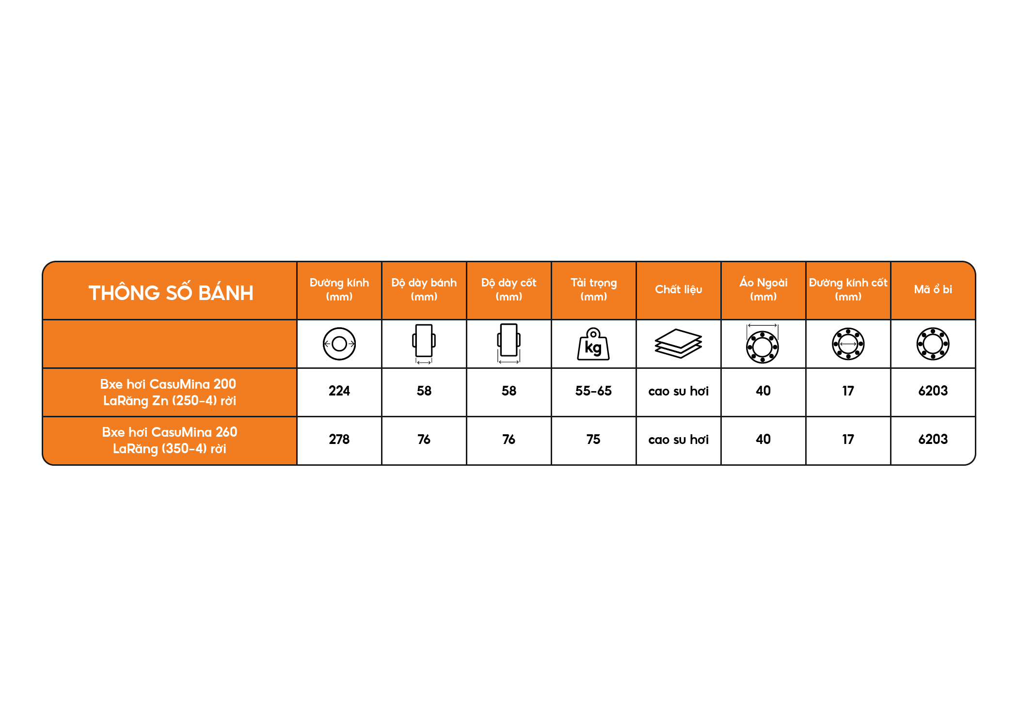 Đây là loại bánh xe cao su bơm hơi được sản xuất bởi hãng Casumina. Bánh xe có cốt bánh làm từ vật liệu gang, mang lại cấu trúc chắc chắn cho bánh. Mặt bánh được làm từ chất liệu cao su mềm với phần trong rỗng có thể bơm hơi, thiết kế này giúp bánh xe mang lại một hành trình êm ái nhất có thể cho hàng hóa. Với thiết kế tập trung vào hành trình vận chuyển êm ái, bánh xe này rất phù hợp cho ai có nhu cầu vận chuyển hàng hóa dễ vỡ, sử dụng rất tốt ở các môi trường gồ gề.