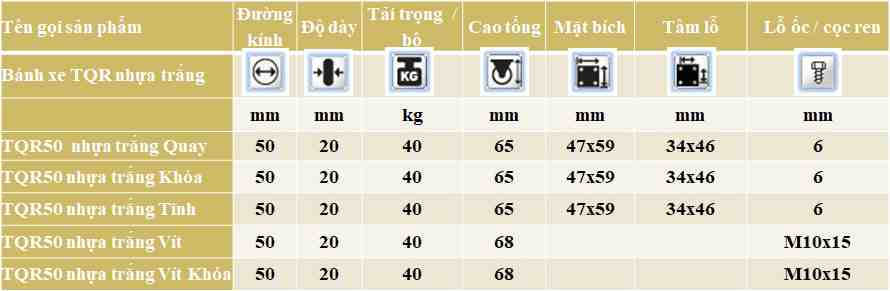 Sản phẩm bánh xe đẩy TQR nhựa là dòng bánh xe giá rẻ hiện tại đang được sử dụng phổ biến trong xã hội và đời sống nhờ vào tính tiện dụng, độ bền và giá cả hợp lý. Tuy nhiên dòng bánh xe TQR nhựa trắng còn tồn tại một số hạn chế như khi di chuyển gây tiếng ồn, độ bền kém, di chyển trên đoạn đường gồ ghề rất khó khăn, chịu tải trọng thấp không phù hợp với cường độ làm việc cao, khả năng kháng hóa chất kém, chống mài mòn thấp.